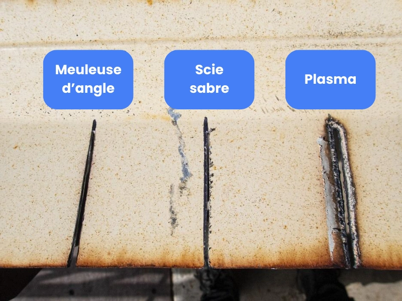Le trait de coupe avec un meuleuse d’angle correspondra à l’épaisseur du disque utilisé. Idem pour l’épaisseur de la lame avec une scie sabre. Le trait de coupe avec un découpeur à plasma dépendra de nombreux paramètres de réglages de celui-ci et des caractéristiques de la buse. Notez qu’avec un découpeur à plasma, pour découper parfaitement droit (si cela est vraiment nécessaire) un guide vous sera particulièrement utile.